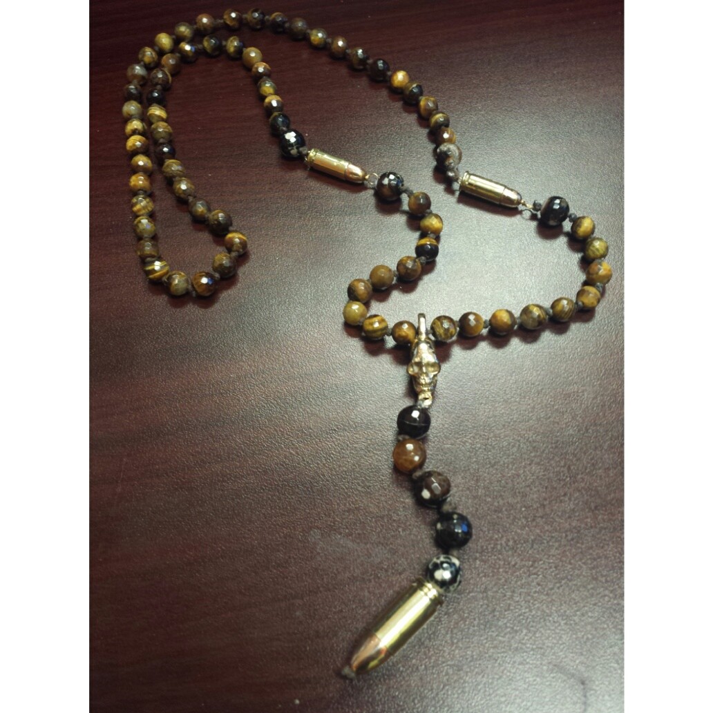 Natural Tiger eyes, 3 dipped in rose gold caliber bullets (2-22mm caliber & 1-9mm caliber) and rose gold dipped skull. 42 Inches long.