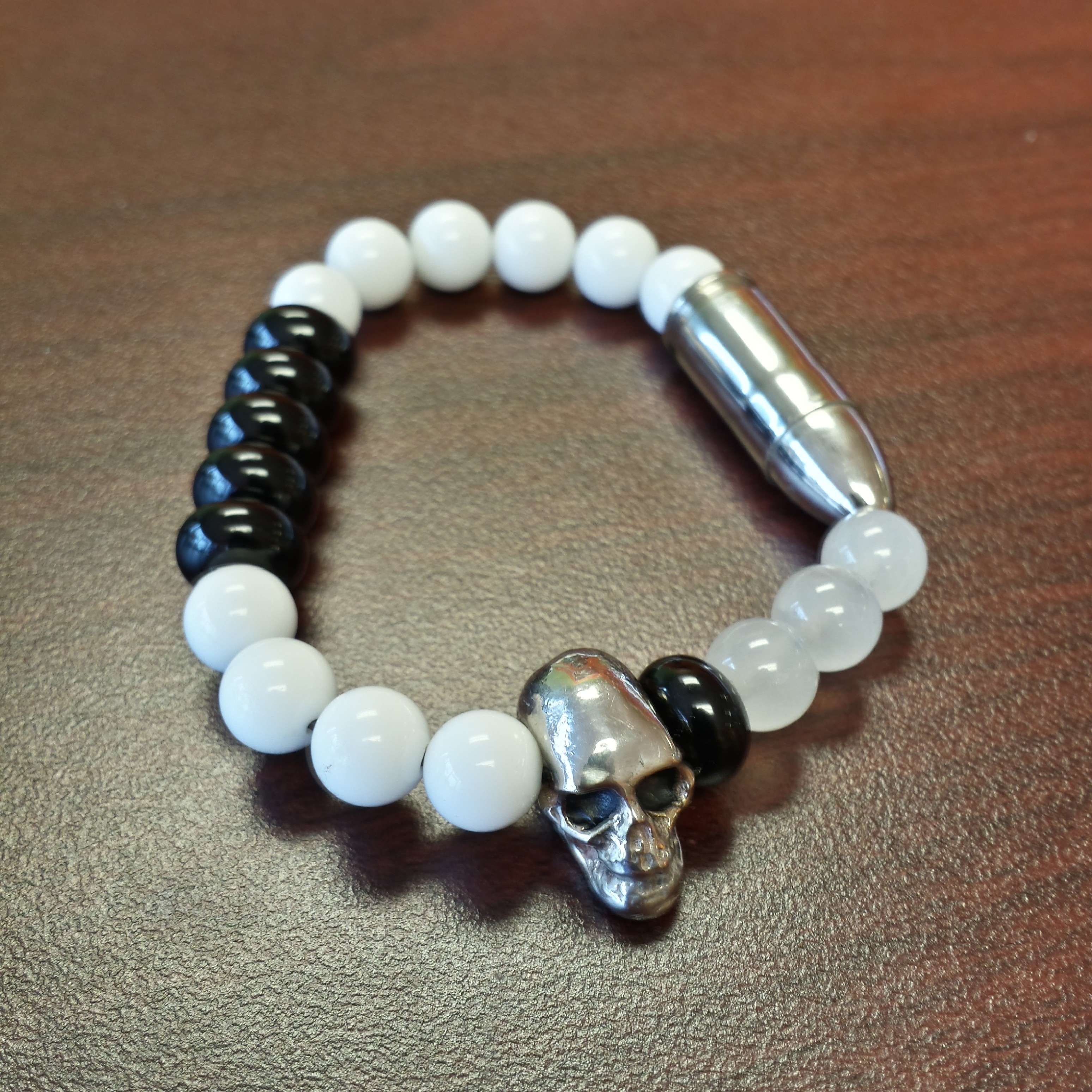Silver Nickel Plated Skull and 9mm bullet, black onyx, moon stone for the sole effects of the kicks and white agate.