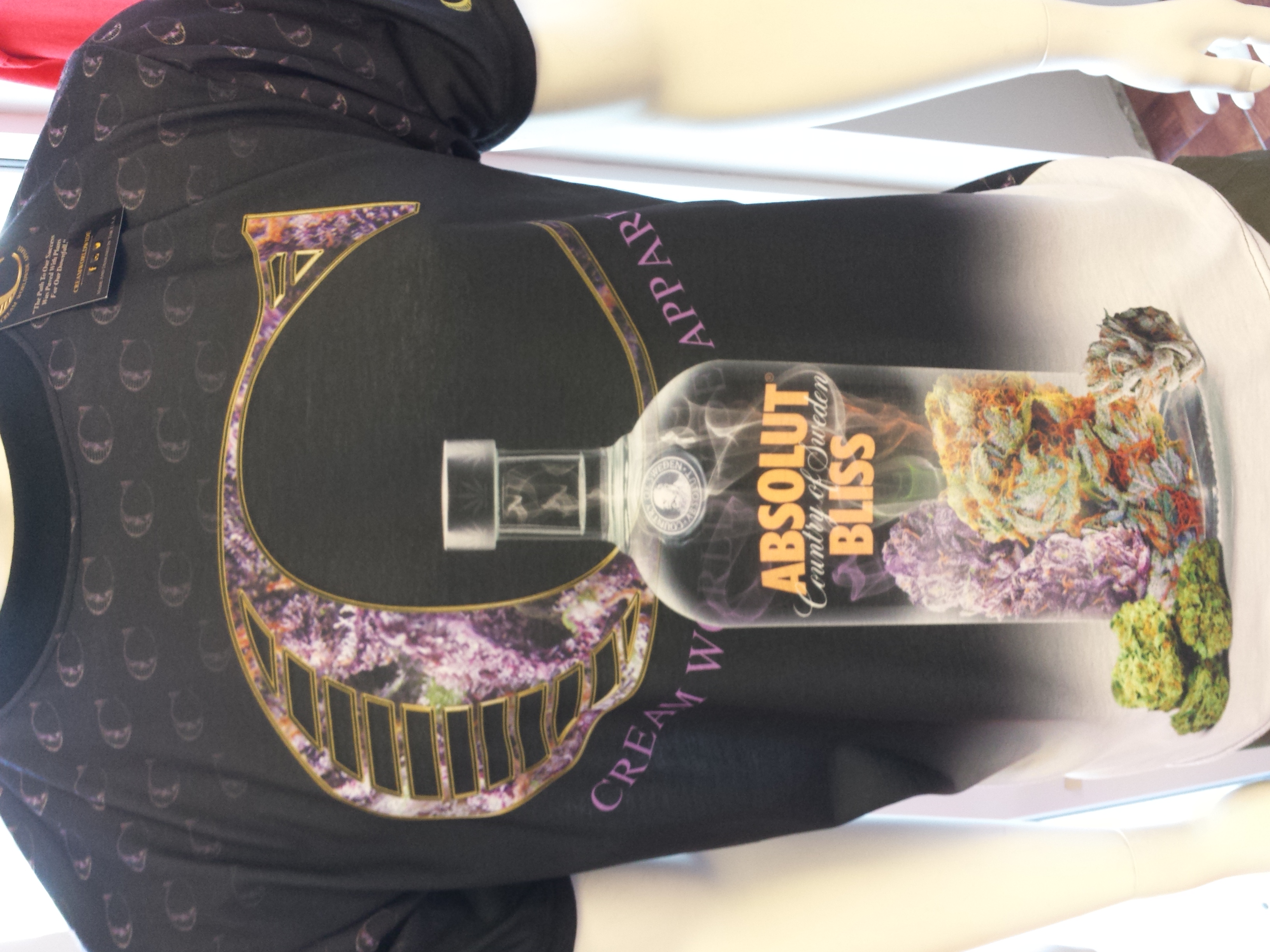 Cream Worldwide Streetwear Sublimated T-shirts are printed on a superior quality 100% Polyester Fabric to maximize color retention, while retaining a very soft feel to the touch. Cream Worldwide shirts are custom cut-and-sew garment which prevents crinkles and errors at seams that printing on generic ready made shirts cannot avoid. The Absolut Bliss Design is printed on both the front and the back.
