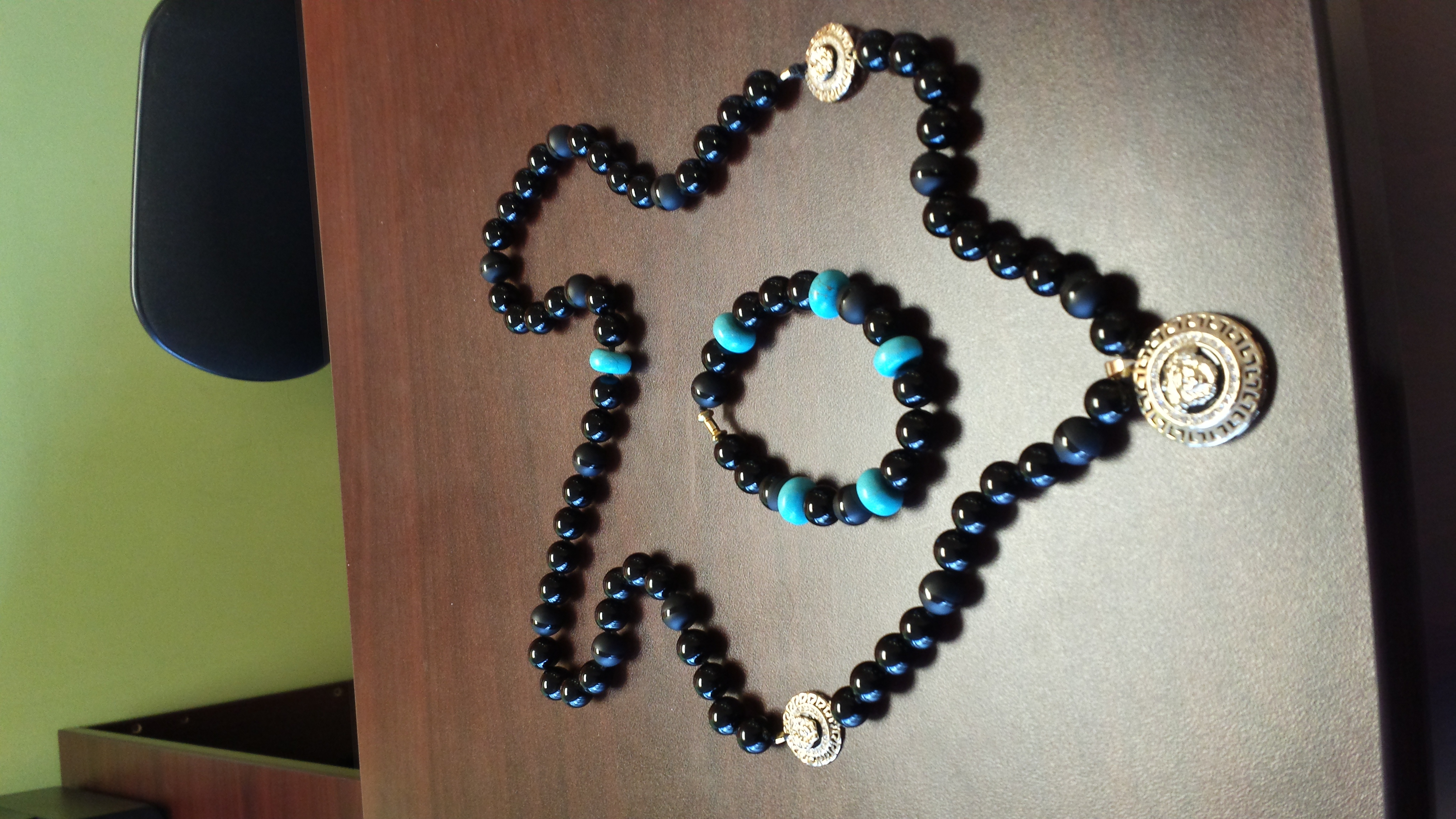 Authentic Natural Black Striped Onyx and authentic black onyx stone. Pearl Knotting so your beads will never fall off. 3 Rose gold plated lions. 36 inches long and bracelet fits size 7 - 9 inches on wrist.